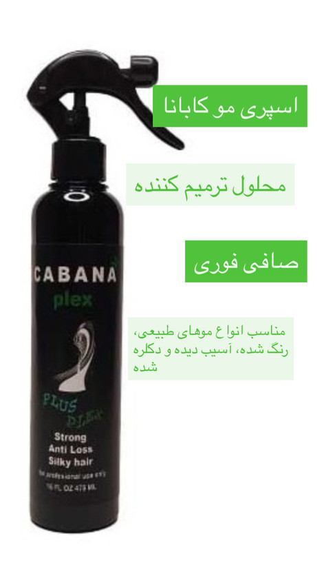 اسپری کابانا یک محلول ترمیم کننده و صافی فوری انواع مناسب انواع موهای طبیعی، رنگ شده، آسیب دیده و دکلره شده است. با اسپری کابانا مو هایی که بر اثر استفاده از مواد دکلره، رنگ و سایر مواد شیمیایی دچار آسیب دیدگی شده اند، اسـتقامت خود را بازیافته به حـالت اول خود برگردانده، ترمیم می کند و به مو حالـت نرم و ابریشــمی می دهد و باعث طراوت و شادابی آن می گردد.