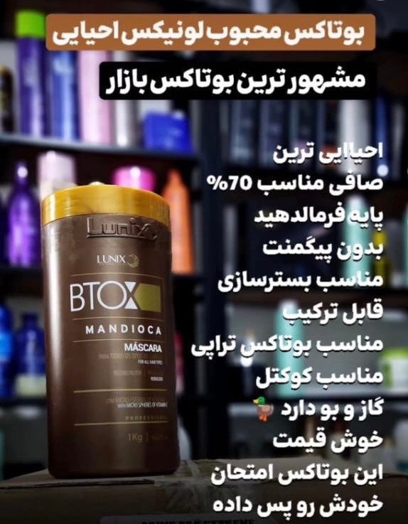 یک محصول فوق العاده از کمپانی لونیکس برزیل، برای درمان موهای خشک و وز و آبرسانی و احیا موهای آسیب دیده، متشکل از روغن ماندیوکا نتیجه عالی برای موهای شما به ارمغان می آورد. بوتاکس لونیکس یکی از بهترین بوتاکس های موجود در بازار بوده که در ترکیب با وان پلکس فلوراکتیو هم به عنوان بستر ساز و رفع کشسانی مو مورد استفاده قرار می گیرد. بوتاکس لونیکس با ساختار سازی مو و همچنین برگرداندن پیوند های آسیب دیده مو که بر اثر دکلره و رنگ و تابش نور آفتاب و حتی موخوره ایجاد شده، موهایی با طراوت و سالم را به شما هدیه می دهد. بوتاکس مو لونیکس بدون مواد شیمیایی مضر بوده و سلامت شما و مشتری تان را تضمین می کند.