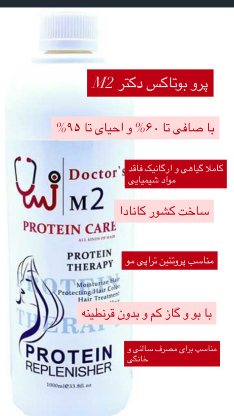 پروتئین و بوتاکس دکتر ام دو با صافی تا ۶۰% و احیای تا ۹۵% مناسب انواع مو علی الخصوص موهای آسیب دیده و کشسان هست. این محصول کاملا گیاهی و ارگانیک با بو و گاز کم و بدون قرنطینه می باشد. پروتئین مو برای درمان مو های که آسیب دیدگی های آن بر اثر رنگ و دکلره مو ها به وجود آمده است مناسب است. درصد احیا این پروتئین بسته به میران آسیب دیدگی مو از ۷۰% تا ۱۰۰% متغییر می باشد، درصد صافی آن حداقل ۵۰% و حداکثر ۶۰% می باشد.